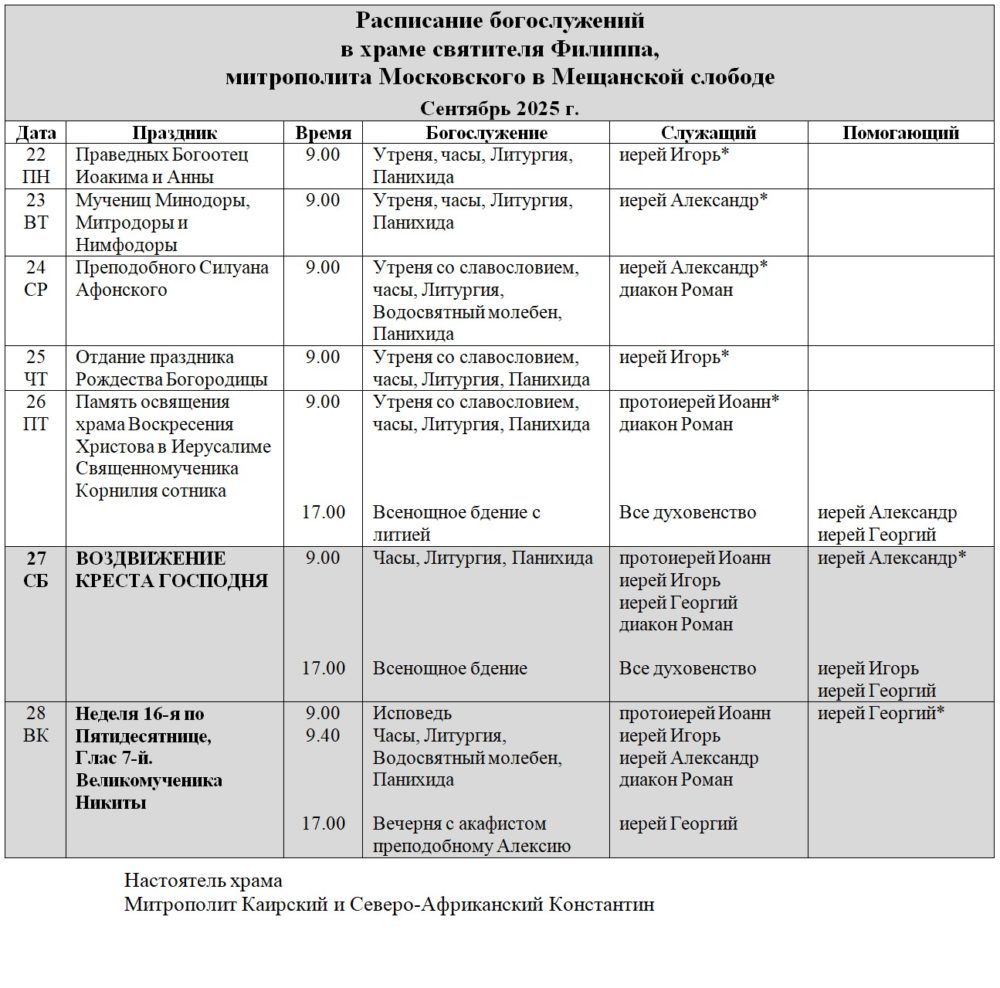 Божественную литургию в храме святителя Филиппа, митрополита Московского, возглавил настоятель храма святителя Филиппа митрополит Каирский и Северо-Африканский Константин, Патриарший экзарх Африки. Ему сослужили благочинный церквей Сретенского округа Московской епархии протоиерей Олег Клемышев, клирики и гости храма святителя Филиппа.